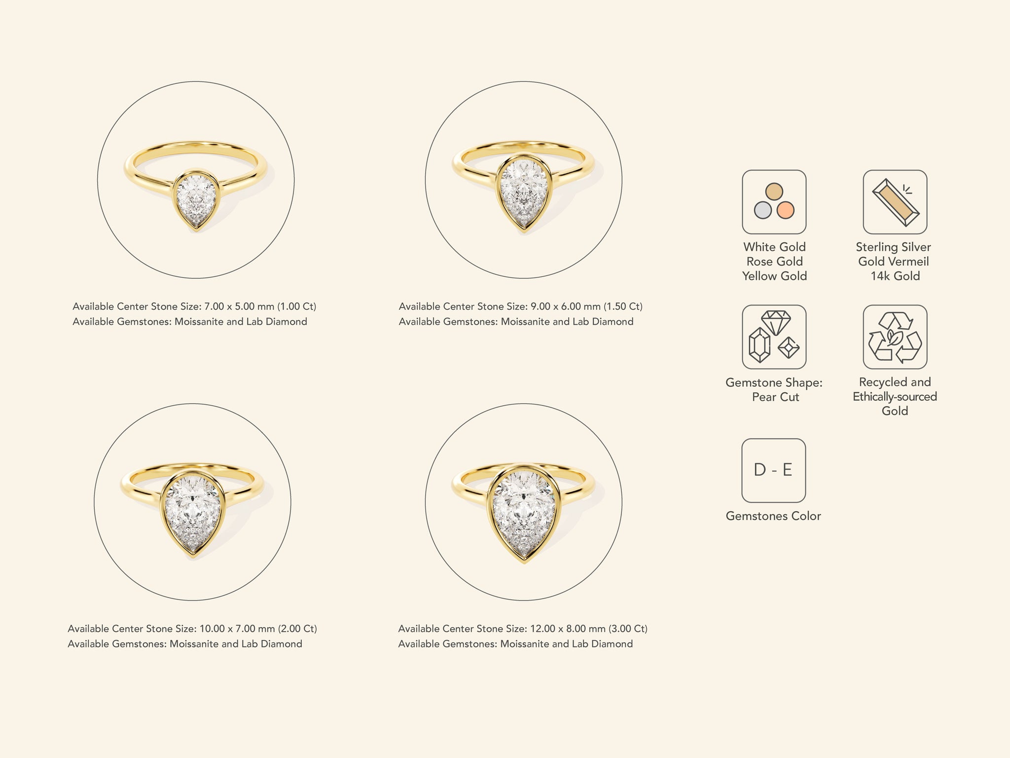 An enduring expression of elegance, this Bezel Pear Engagement Ring is crafted with care in 14k solid gold, gold vermeil, or sterling silver. Its brilliant 1 carat pear-cut stone sits on a slim, refined band, designed to shine with the quiet confidence of lab grown diamond or moissanite stone in every moment. Whether given as a symbol of love, a celebration of a milestone, or simply a piece to cherish every day, this ring offers lasting beauty and meaning.
