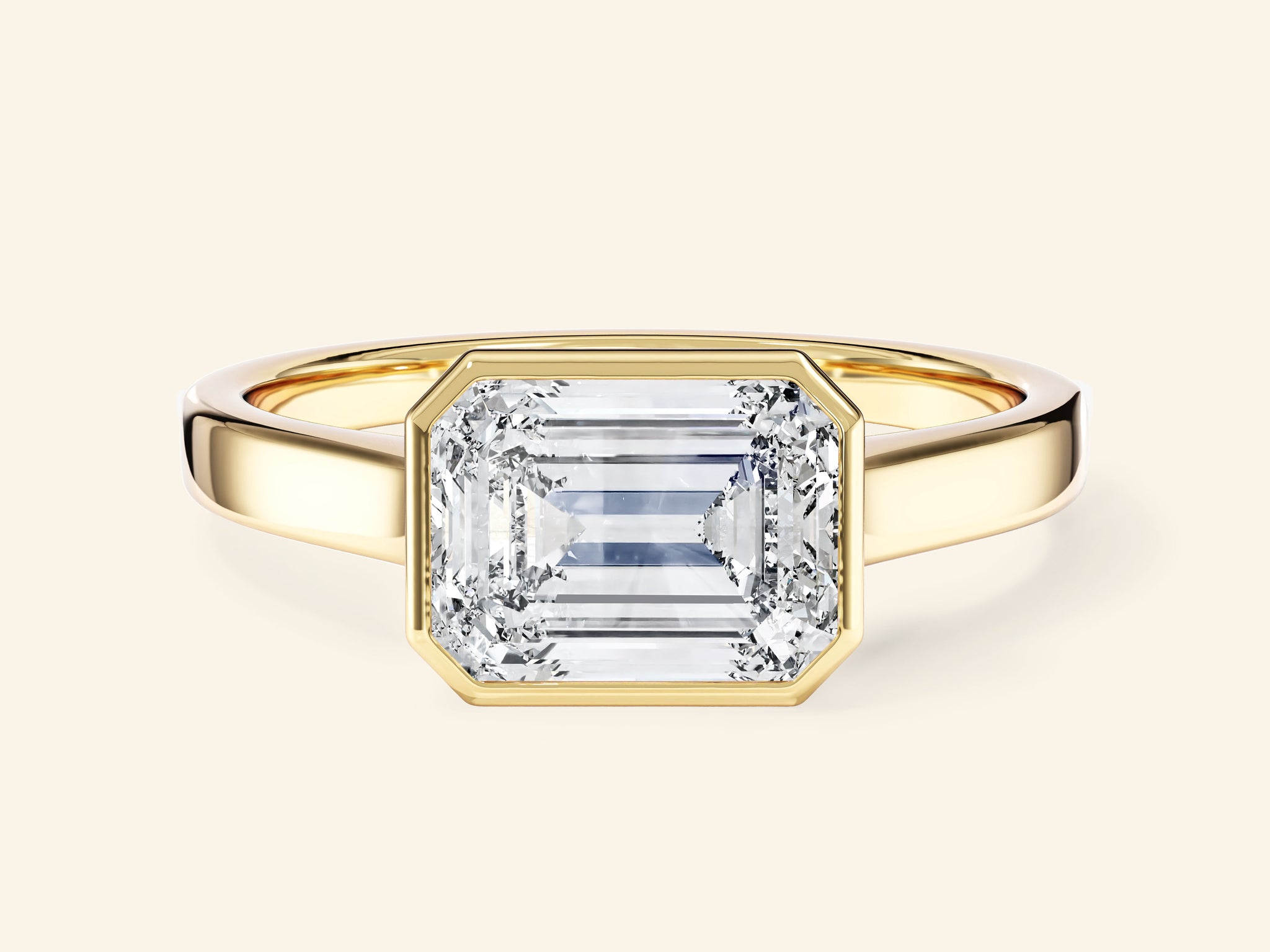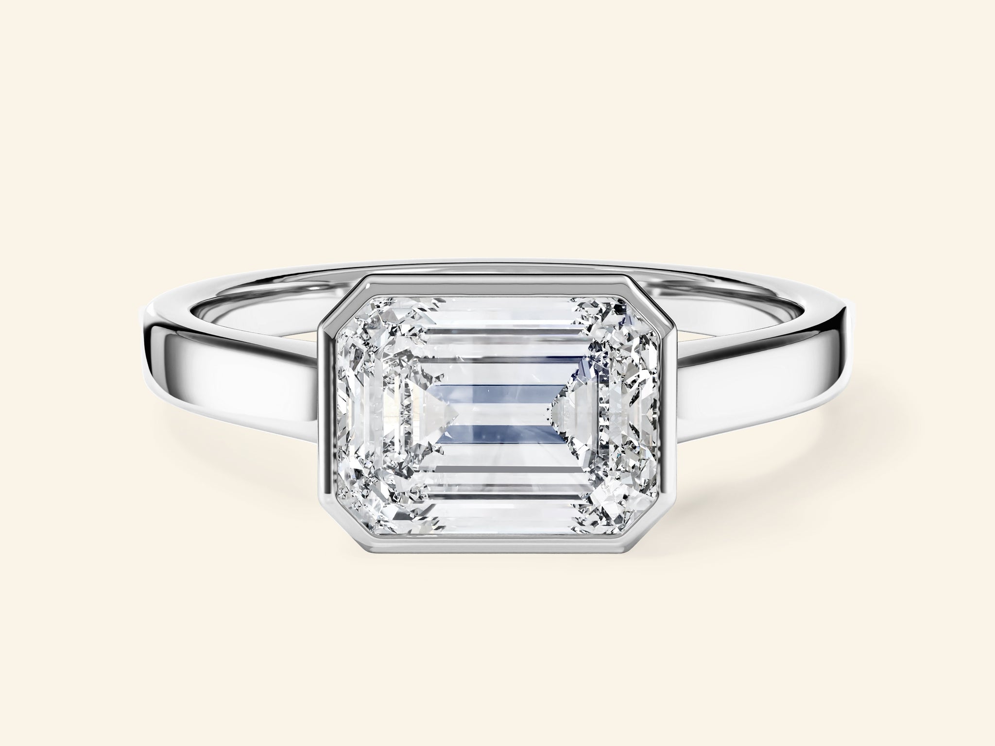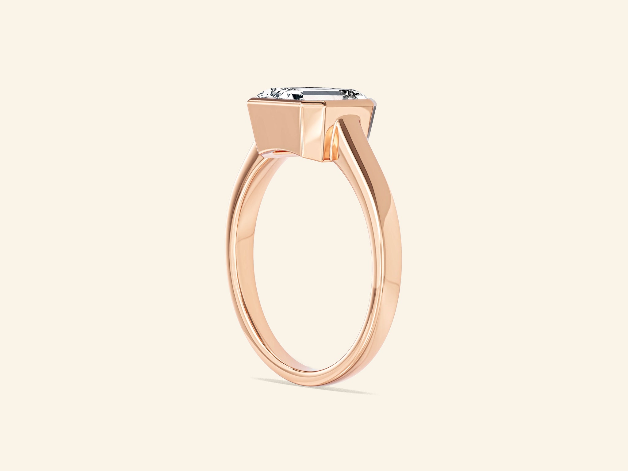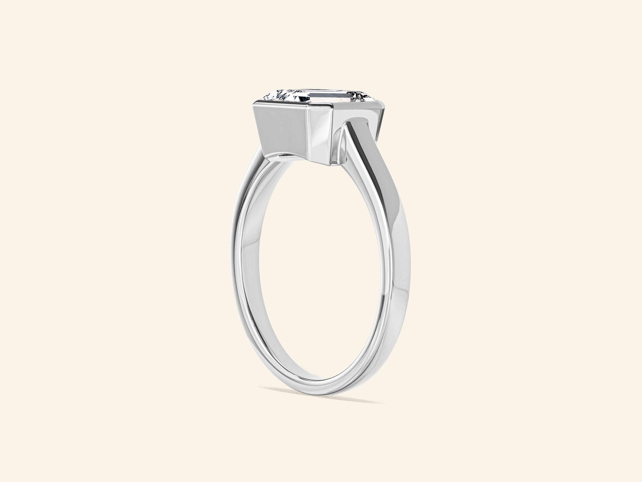 Sleek, modern, and timeless, this emerald cut engagement ring features a flat, straight-edge band that perfectly complements the elongated, step-cut center stone. Its clean lines and minimalist design highlight the stone’s clarity and brilliance, creating a sophisticated and elegant look.