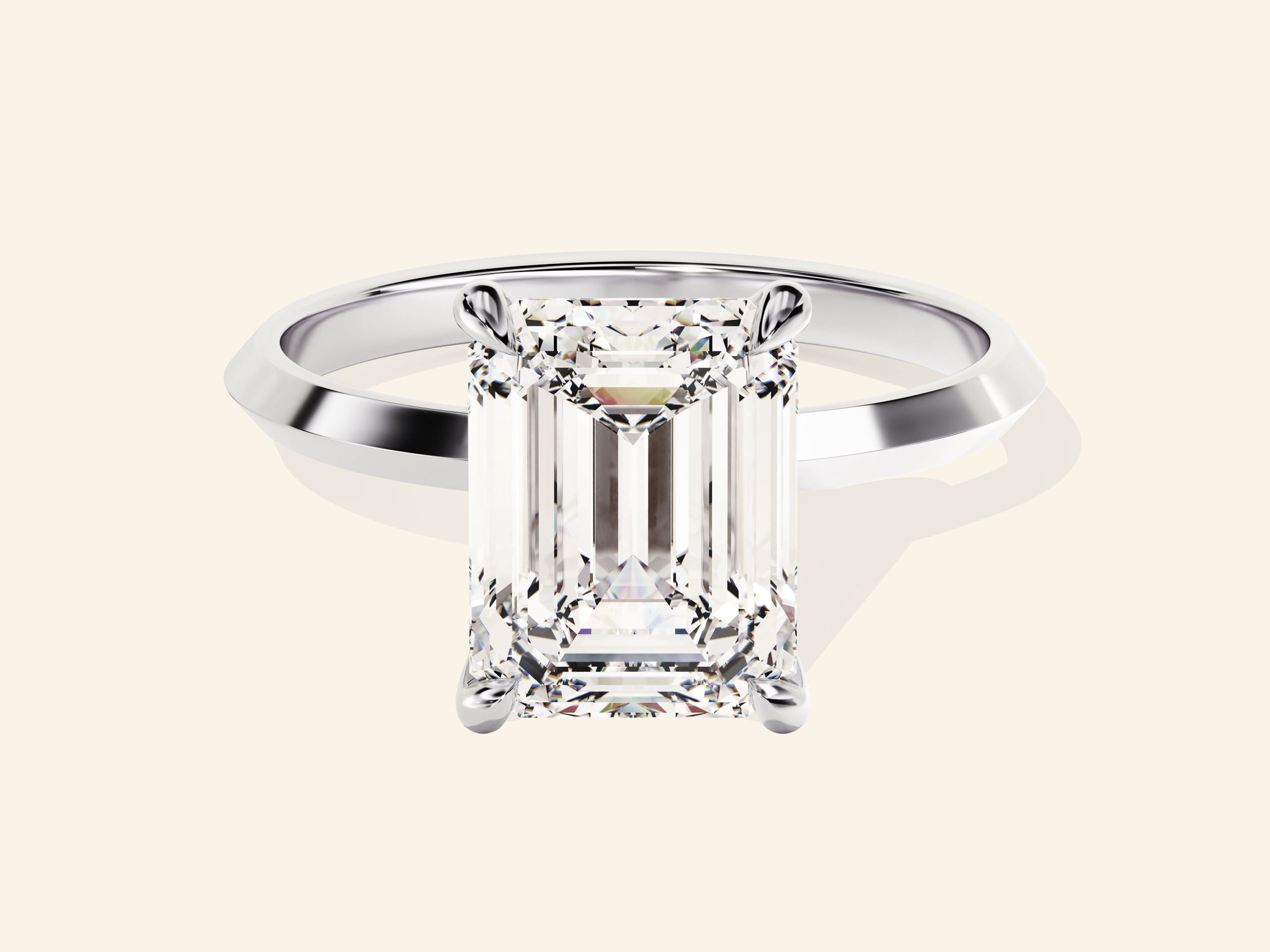 An enduring expression of elegance, this Knife Edge Emerald Engagement Ring is crafted with care in 14k solid gold, gold vermeil, or sterling silver. Its brilliant 3 carat emerald-cut stone sits on a slim, refined band, designed to shine with the quiet confidence of lab grown diamond or moissanite stone in every moment. Whether given as a symbol of love, a celebration of a milestone, or simply a piece to cherish every day, this ring offers lasting beauty and meaning.
