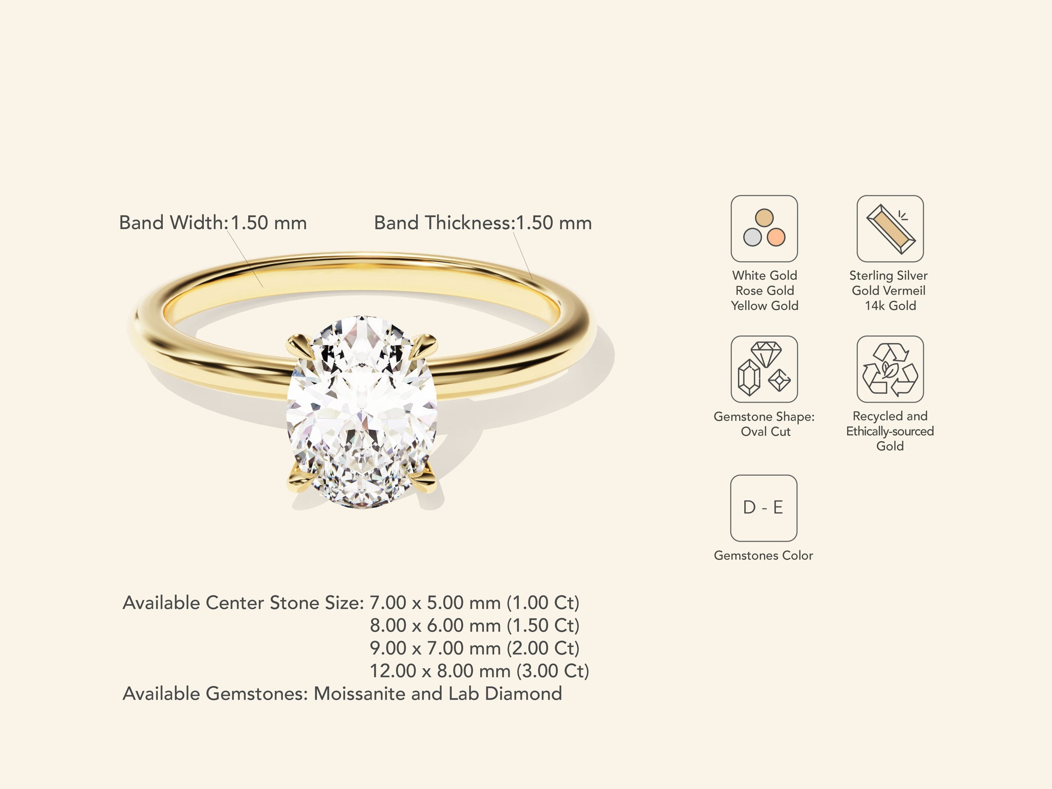 An enduring expression of elegance, this 4-Prong Solitaire Oval Engagement Ring is crafted with care in 14k solid gold, gold vermeil, or sterling silver. Its brilliant 1.50 carat oval-cut stone sits on a slim, refined band, designed to shine with the quiet confidence of lab grown diamond or moissanite stone in every moment. Whether given as a symbol of love, a celebration of a milestone, or simply a piece to cherish every day, this ring offers lasting beauty and meaning.
