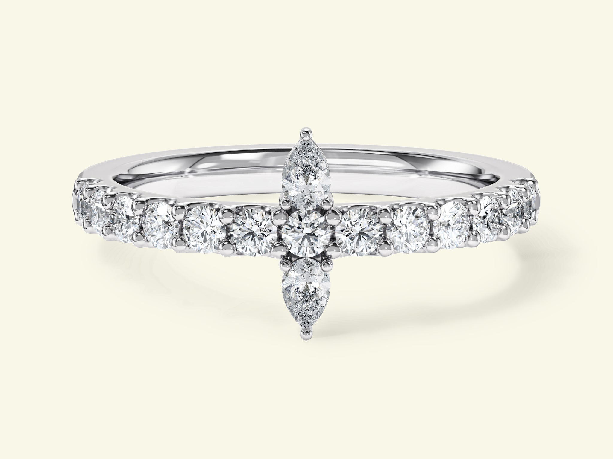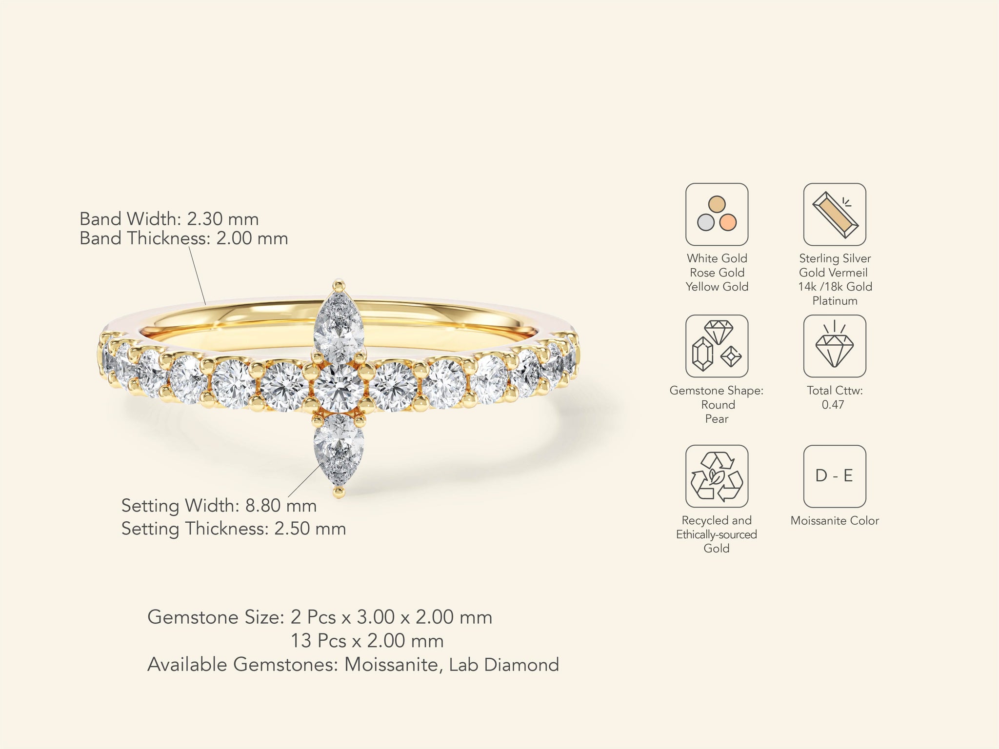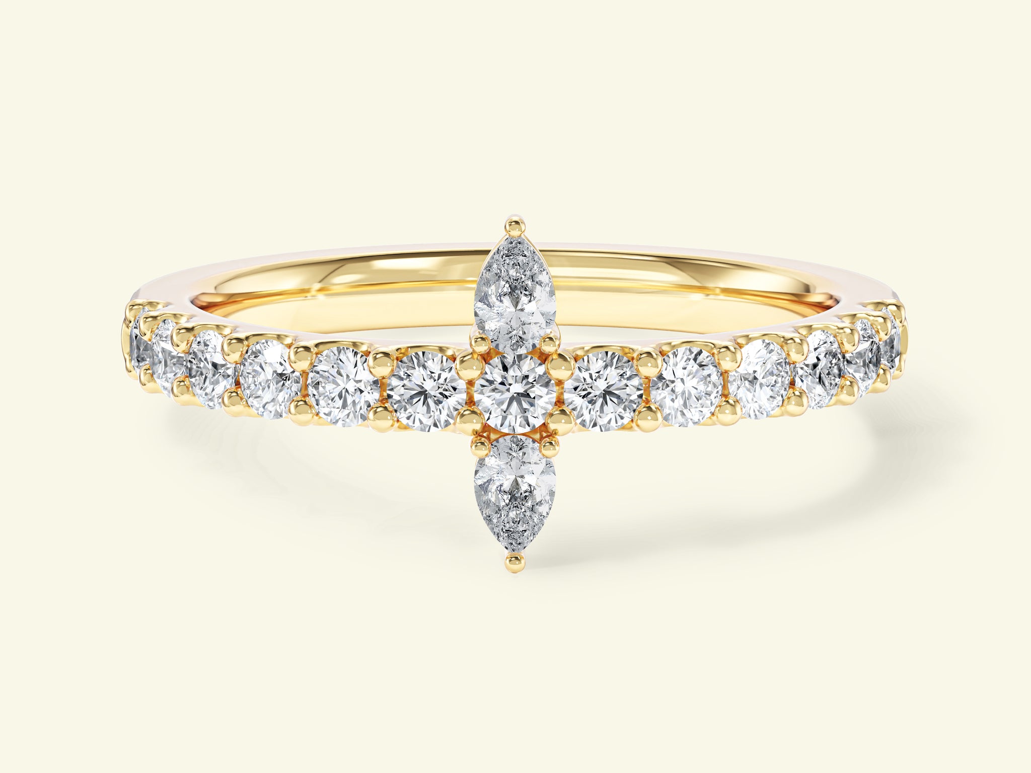 The Celestial Promise Ring shines with a row of brilliant round moissanites, gracefully intersected by two pear stones forming a radiant cross. Set in gold or silver, this design captures balance, brilliance, and the eternal beauty of a promise written in the stars.