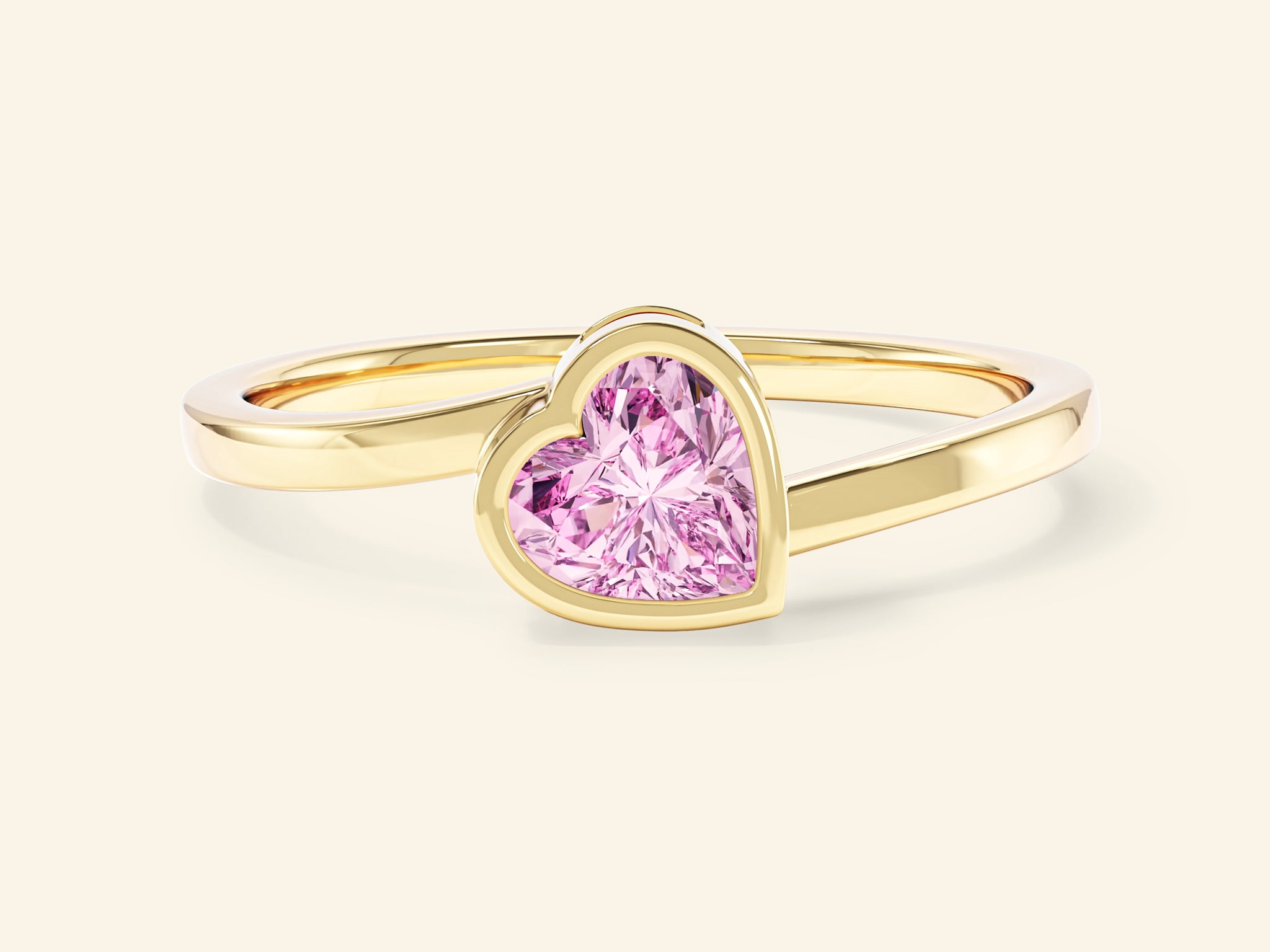 Sweet and symbolic, this ring features a solo heart-cut pink moissanite in a sleek bezel setting. The modern frame highlights its romantic glow, making it a meaningful promise of love with a contemporary touch.