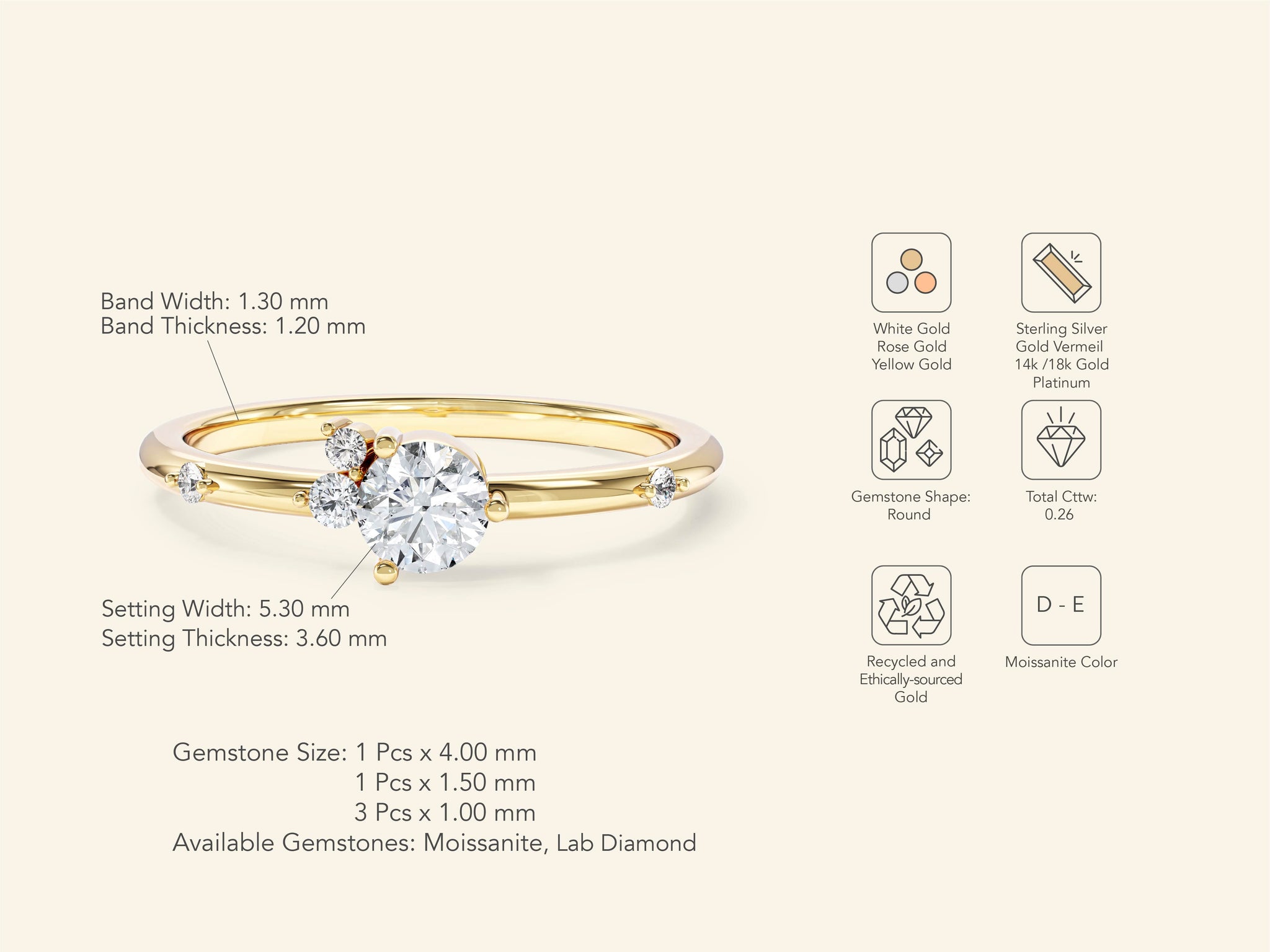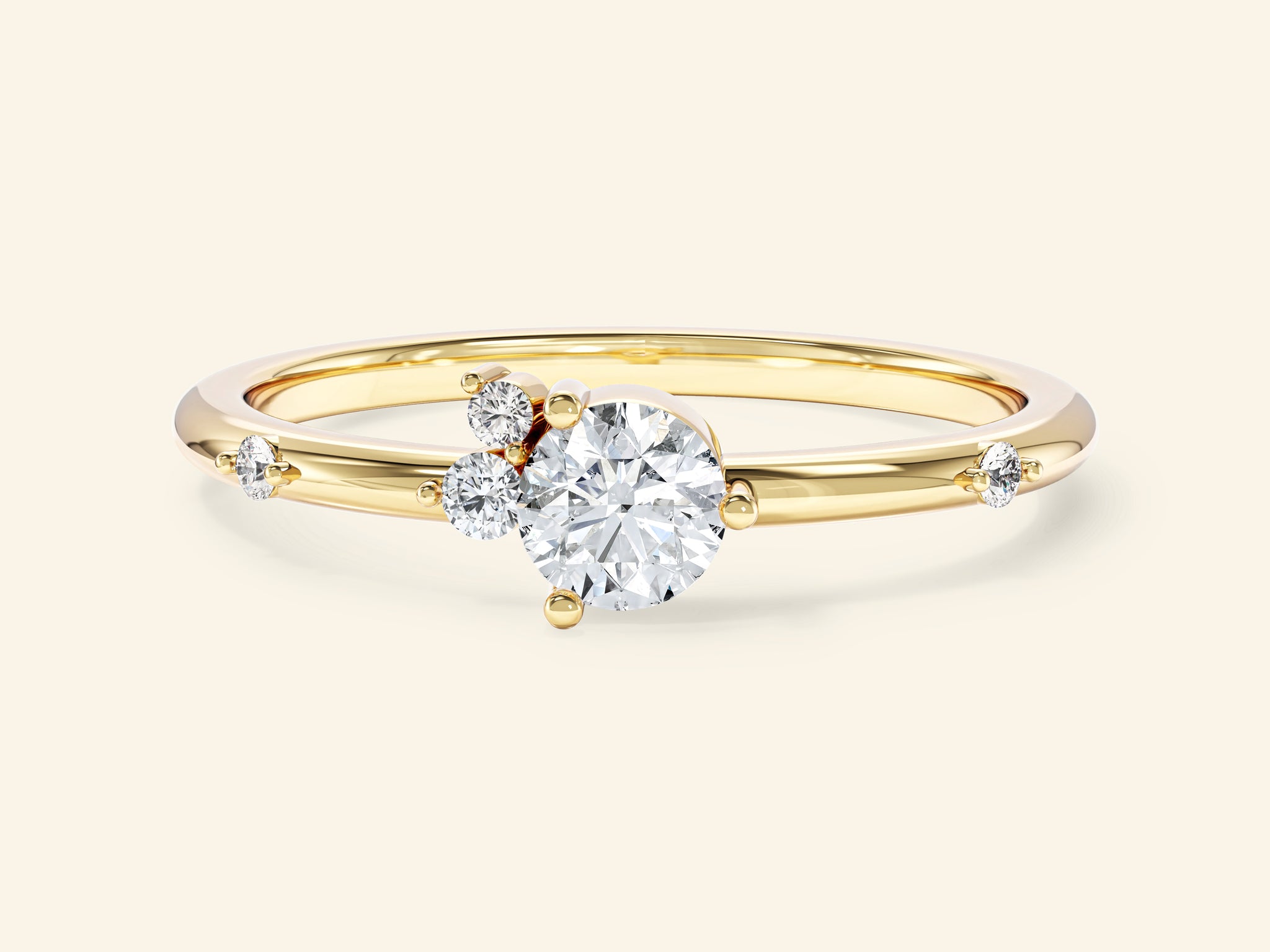 A playful, contemporary design featuring moissanites artfully scattered across the band. Each stone catches the light in its own way, creating a sparkling, unique expression of love and individuality.