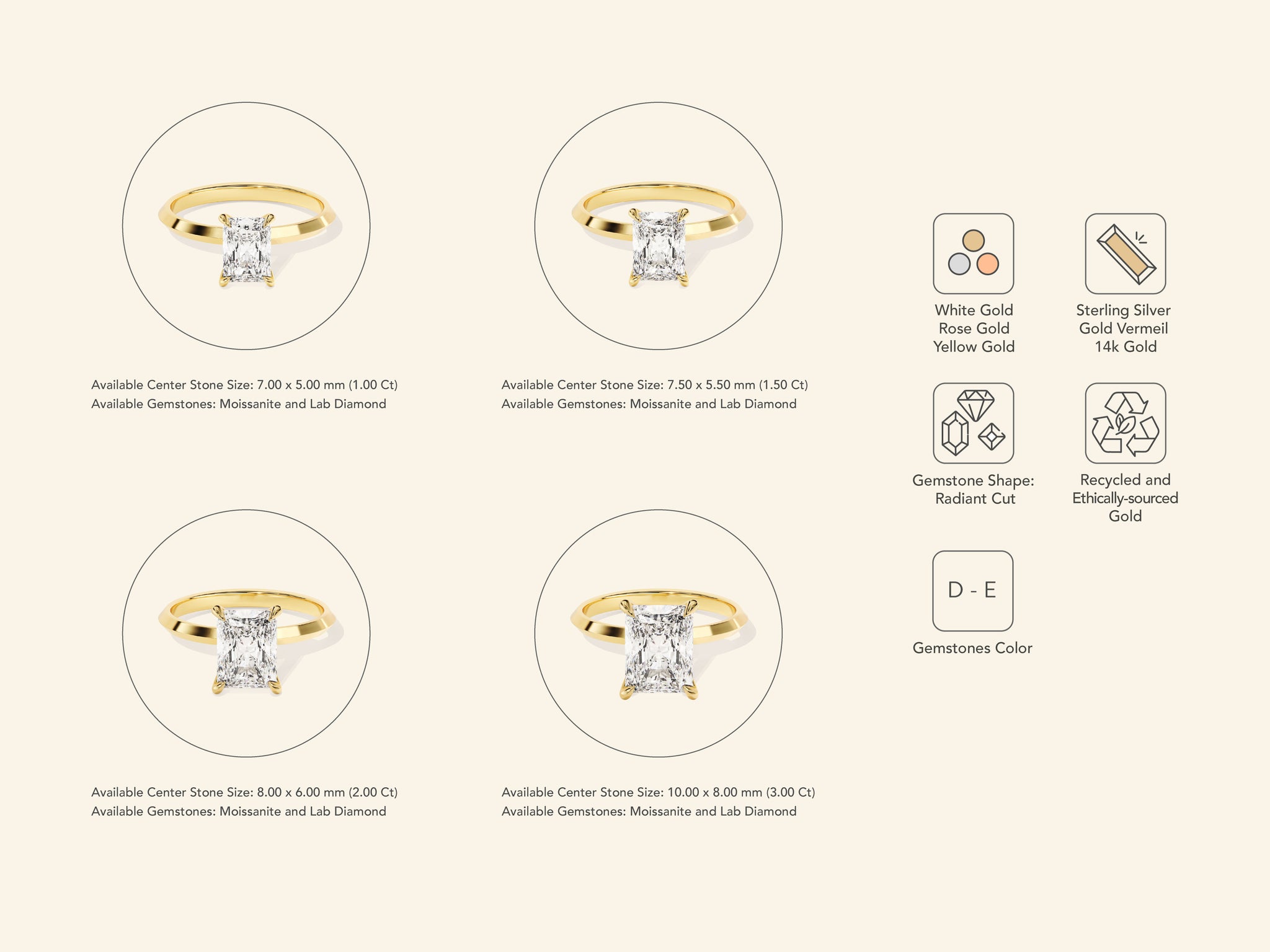 An enduring expression of elegance, this Knife Edge Radiant Engagement Ring is crafted with care in 14k solid gold, gold vermeil, or sterling silver. Its brilliant 2 carat radiant-cut stone sits on a slim, refined band, designed to shine with the quiet confidence of lab grown diamond or moissanite stone in every moment. Whether given as a symbol of love, a celebration of a milestone, or simply a piece to cherish every day, this ring offers lasting beauty and meaning.