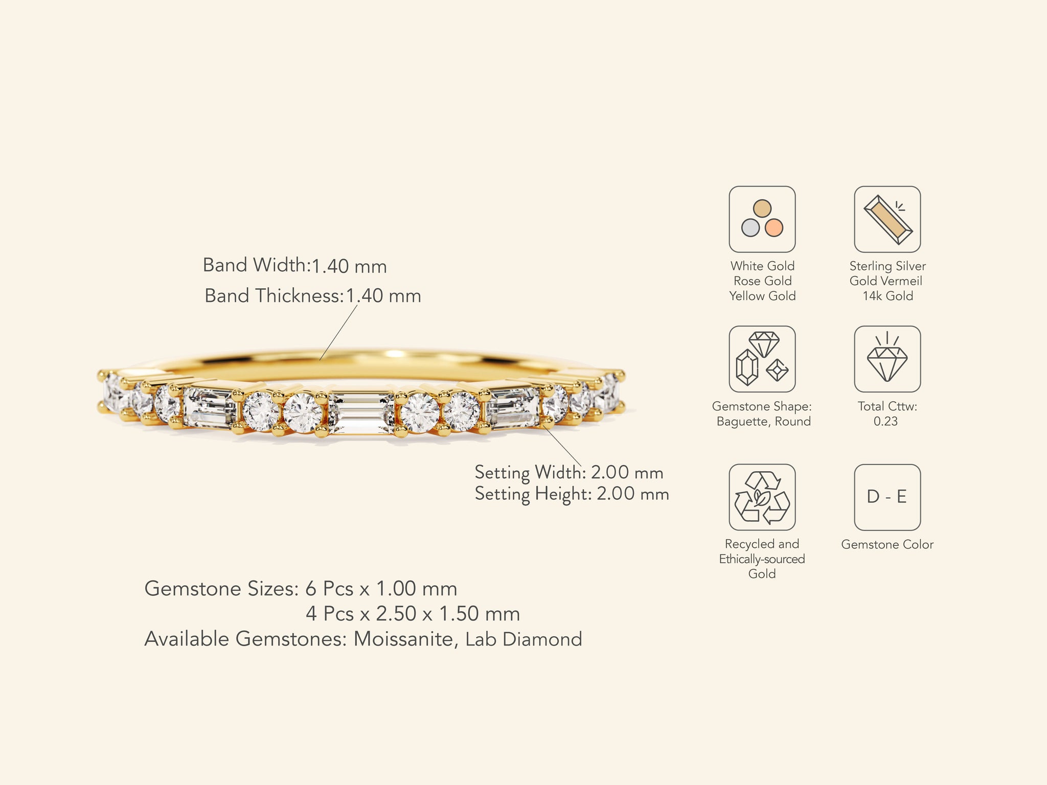 Refined yet understated, the Alternating Baguette Wedding Band ring captures the essence of modern grace. Crafted with precision in 14k solid gold, gold vermeil, or sterling silver, it features luminous stones that catch the eye without ever demanding it. Choose between lab-grown diamond or moissanite. Both ethically sourced and brilliantly cut. Whether it’s a meaningful gift or a personal keepsake, this ring is made to accompany you through every chapter, with beauty that endures.