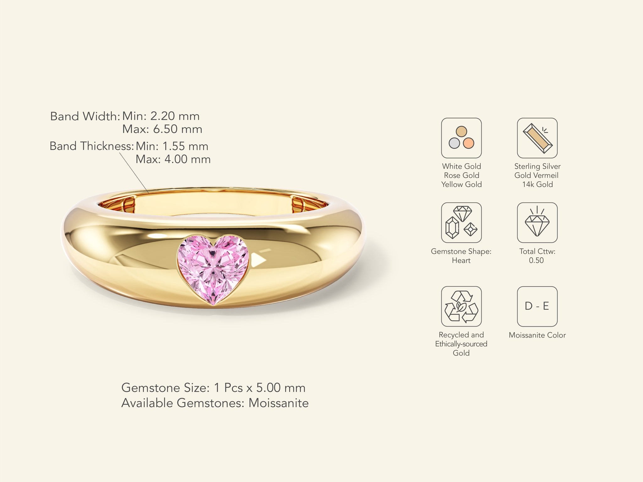 Make a statement with this striking ring, featuring a flush-set heart-shaped pink moissanite. Its vibrant hue and sleek design capture love and individuality in one unforgettable piece.