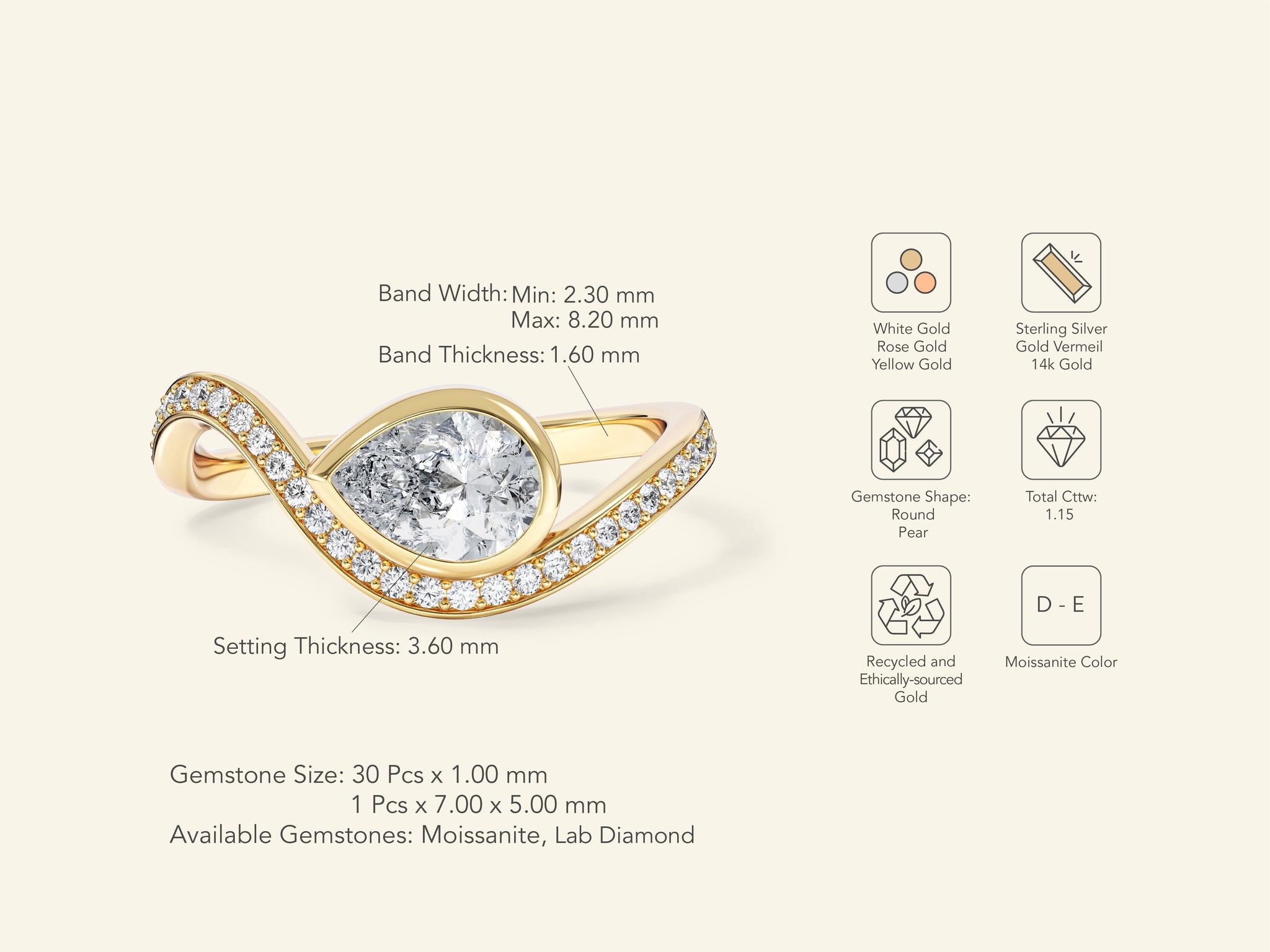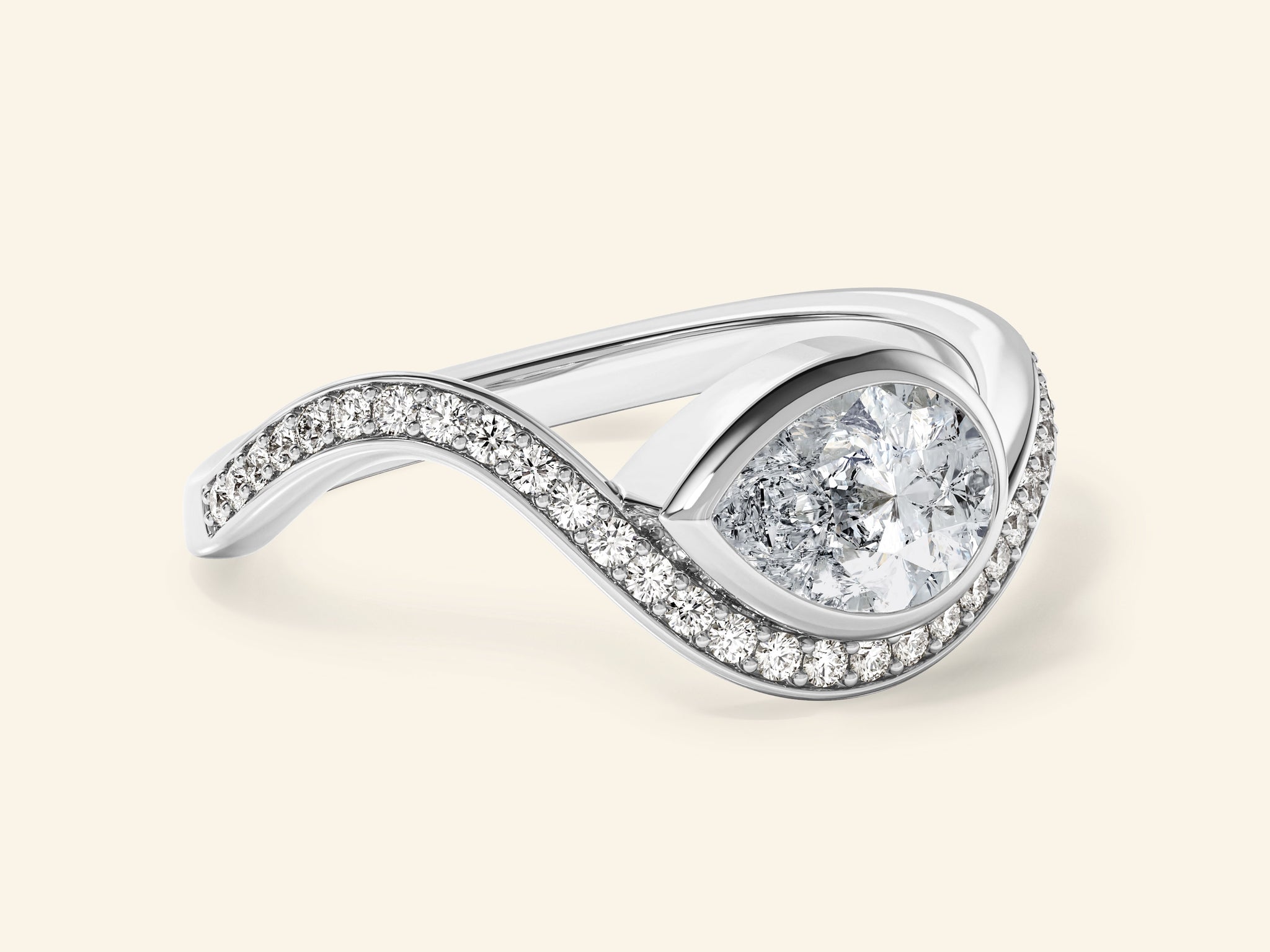 Graceful and elegant, this curved band engagement ring features a sparkling pear-cut center stone embraced by a gently flowing, pave-adorned band. The curving design highlights the stone’s brilliance while adding a soft, feminine silhouette.