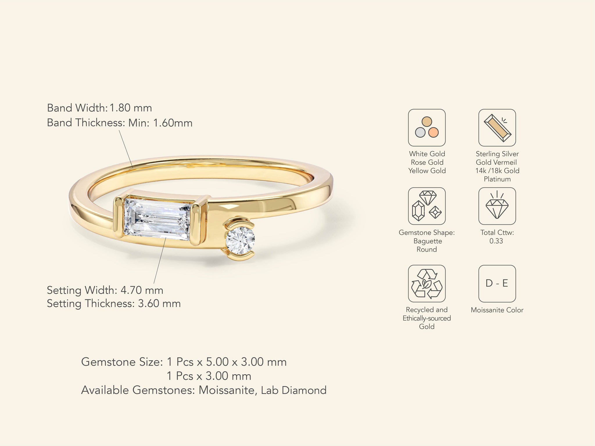 A modern take on timeless romance, this design pairs a sleek baguette-cut gemstone with a brilliant round stone. Together, they symbolize balance and harmony, making it the perfect promise of love and commitment.