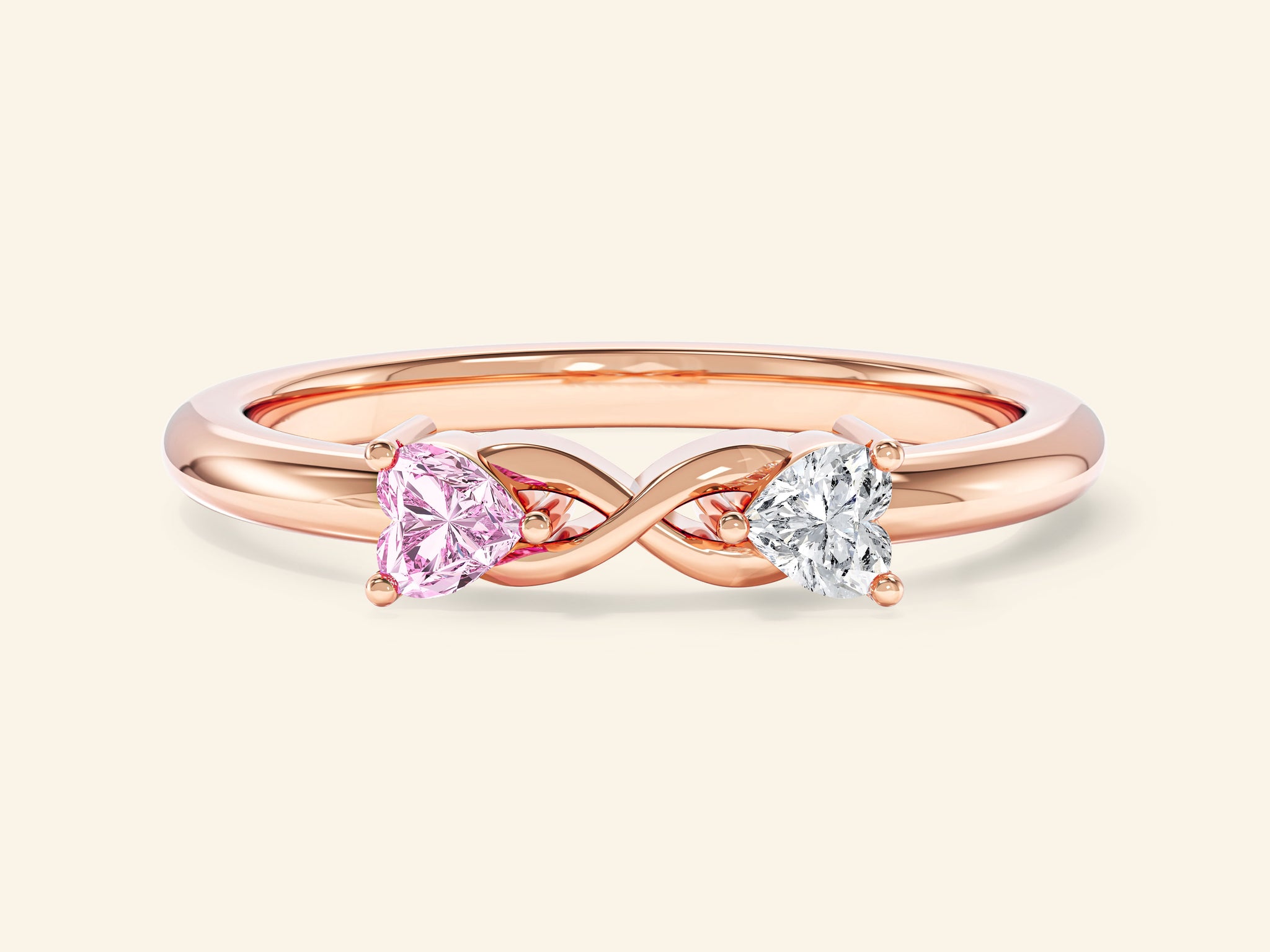 A timeless symbol of everlasting love, this ring features two heart-cut moissanites in a delicate infinity design. One sparkling white and one romantic pink, the stones intertwine to celebrate unity, passion, and a bond without end.