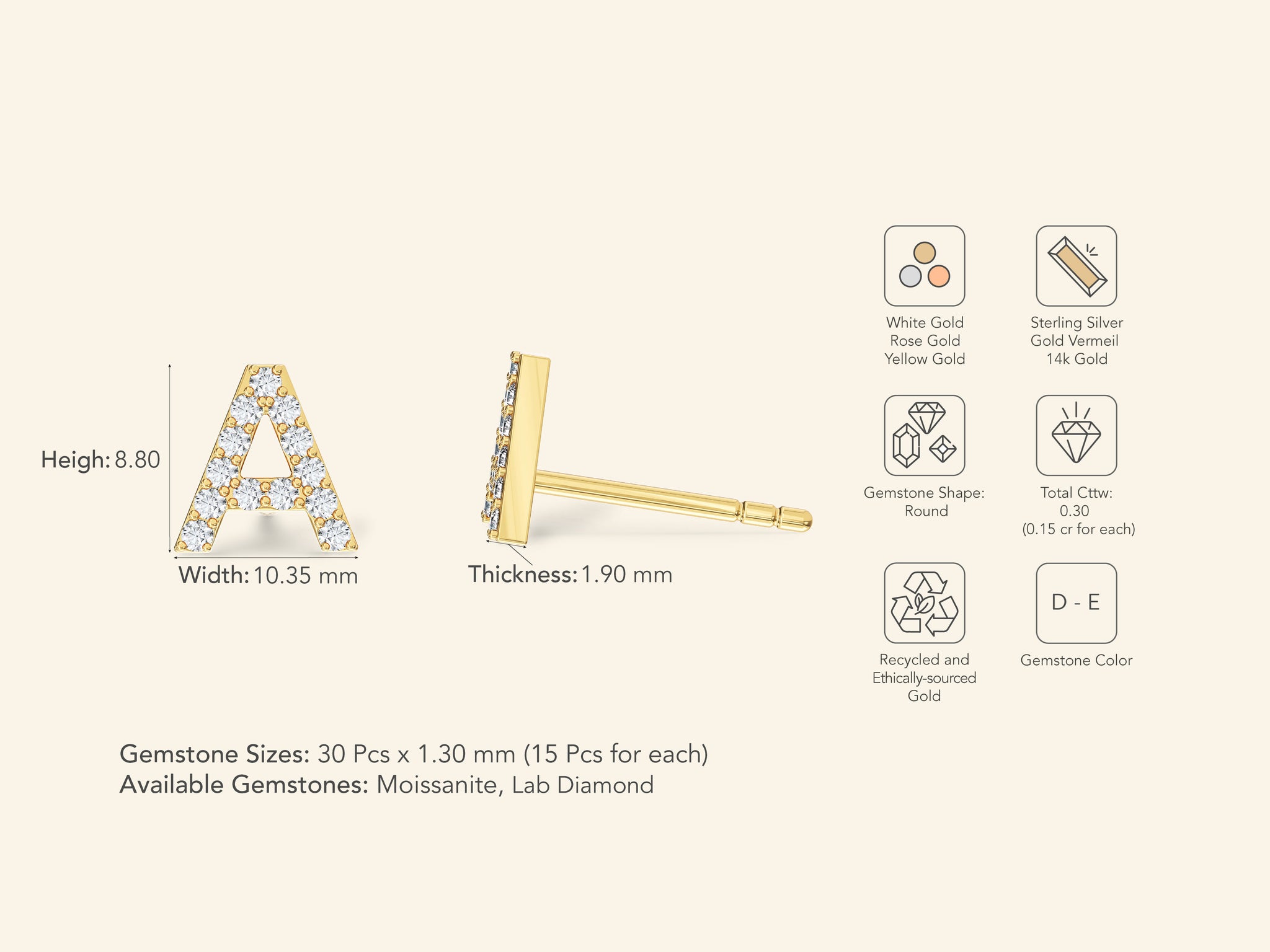Light-catching and effortlessly versatile, the Initial Earrings are designed to move with you. Crafted in 14k solid gold, gold vermeil, or sterling silver, they feature a luminous stones that adds just the right amount of shine. Choose from lab grown diamond or moissanite for personalized touch. Subtle enough for everyday, striking enough for special moments. Whether paired or worn solo, each piece brings a hint of confidence and character to your look. Made to be noticed, but never loud.