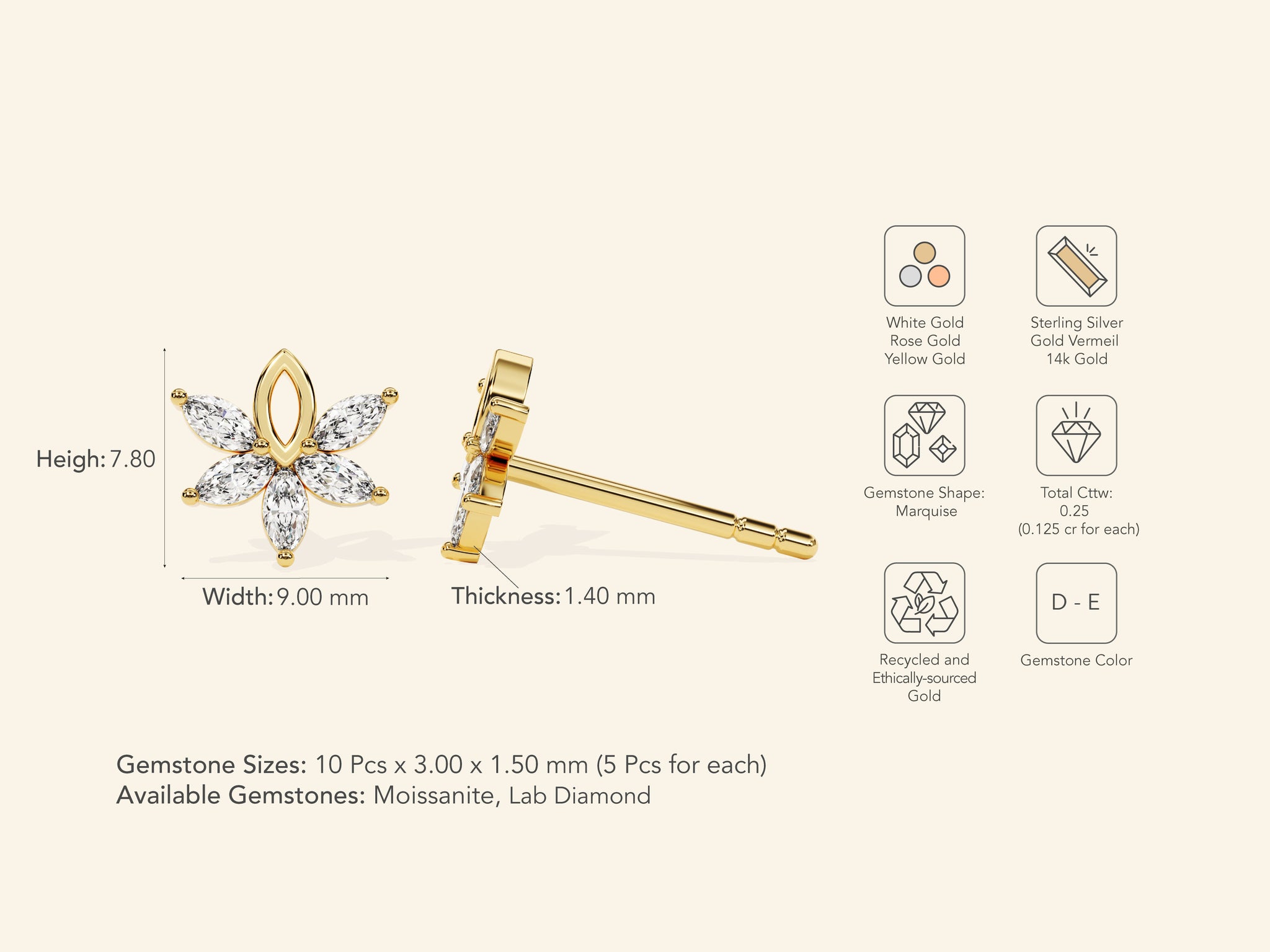 Light-catching and effortlessly versatile, the Marquise Flower Earrings are designed to move with you. Crafted in 14k solid gold, gold vermeil, or sterling silver, they feature a luminous stones that adds just the right amount of shine. Choose from lab grown diamond or moissanite for personalized touch. Subtle enough for everyday, striking enough for special moments. Whether paired or worn solo, each piece brings a hint of confidence and character to your look. Made to be noticed, but never loud.