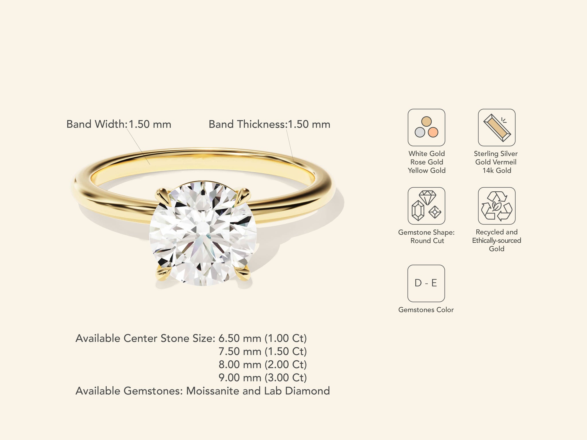 An enduring expression of elegance, this Round Solitaire Engagement Ring is crafted with care in 14k solid gold, gold vermeil, or sterling silver. Its brilliant 1.50 carat round-cut stone sits on a slim, refined band, designed to shine with the quiet confidence of lab grown diamond or moissanite stone in every moment. Whether given as a symbol of love, a celebration of a milestone, or simply a piece to cherish every day, this ring offers lasting beauty and meaning.