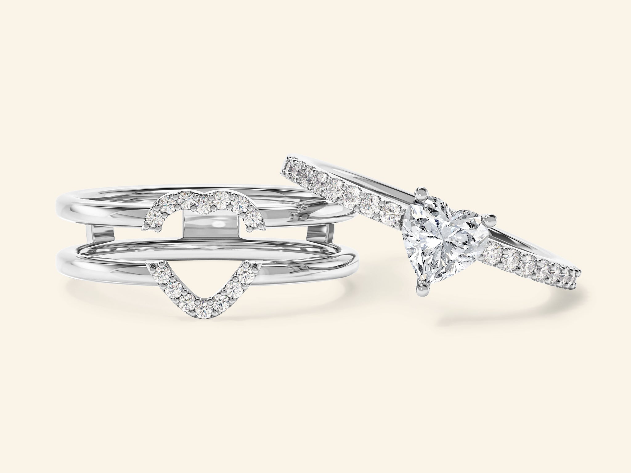 A romantic set that celebrates love in every form. Featuring a heart-cut moissanite center stone accented by pavé-set gems and paired with a double-band heart-shaped enhancer, this trio creates a sparkling symbol of unity, passion, and commitment.